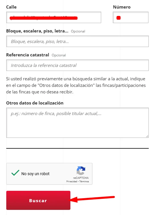 Por último, introduce la dirección completa, el número y rellena el Captcha. Posteriormente, haz clic en «Buscar».