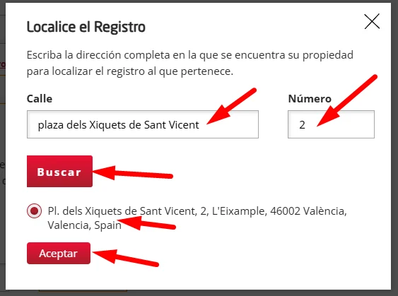 Si tu municipio tiene varios registros y no sabes dónde se encuentra, puedes hacer clic en el texto rojo que hay a la derecha de «Registro» que dice «Si no conoces el Registro, utilice nuestro localizador». Simplemente introduce la dirección, haz clic en «Buscar», selecciona la dirección y haz clic en «Aceptar».