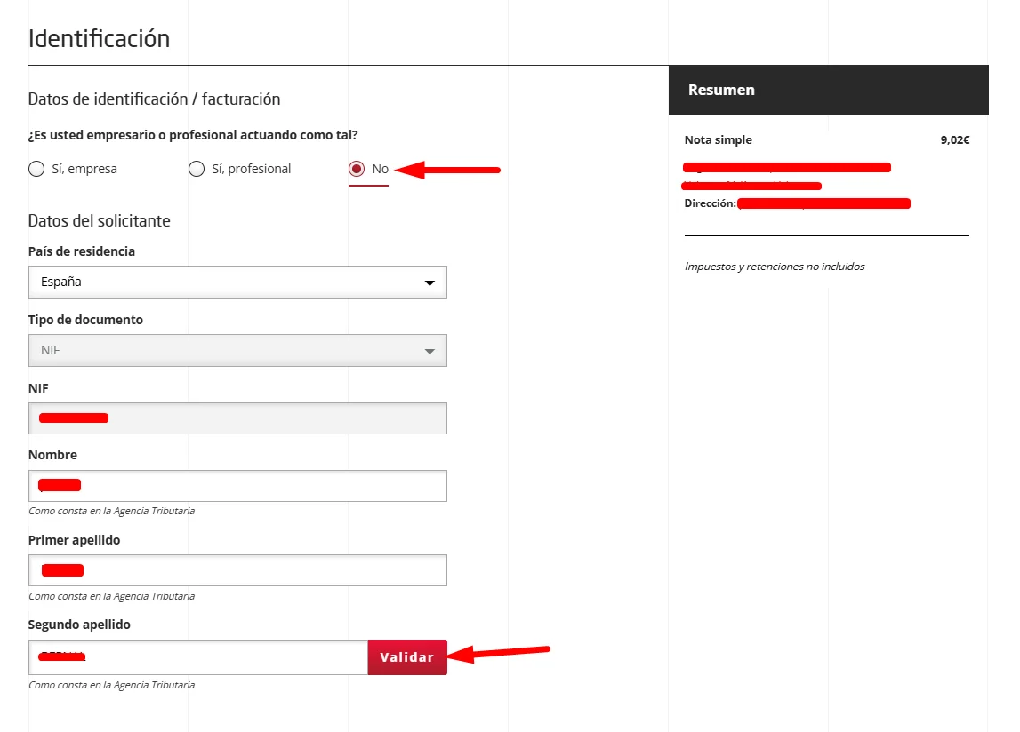 Ahora debes de rellenar tus datos de identificación y en el segundo apellido hacer clic en «Validar».