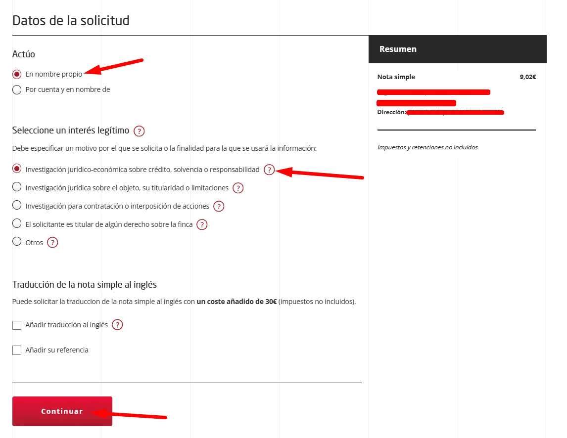 En este paso, da selecciona lo que quieras, ya que no va a influir en nada. Nosotros en este caso vamos a seleccionar «En nombre propio» e «Investigación jurídico-económica sobre crédito, solvencia o responsabilidad». Después haz clic en «Continuar».