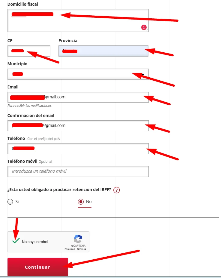 Una vez hagas clic en «Validar», se desplegarán otros campos del formulario que deberás de completar también y hacer clic en el botón «Continuar».